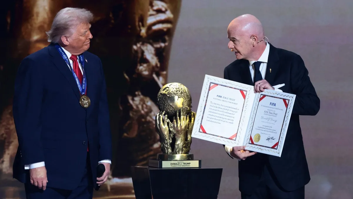 تسلم الرئيس الأميركي دونالد ترمب جائزة فيفا للسلام، الجمعة، والتي قدمها له رئيس الاتحاد الدولي لكرة القدم (فيفا) جياني إنفانتينو، وذلك خلال حفل قرعة كأس العالم المقررة في 2026.