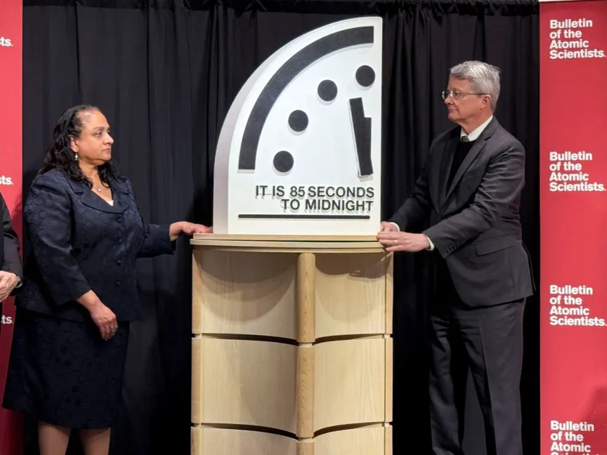 ضبط علماء ذرة عقارب "ساعة نهاية العالم"، الثلاثاء، عند أقرب وقت على الإطلاق من منتصف الليل، مشيرين إلى السلوك العدواني للقوى النووية روسيا والصين والولايات المتحدة، وتدهور الرقابة على الأسلحة النووية، والصراعات في أوكرانيا والشرق الأوسط، ومخاوف الذكاء الاصطناعي، بصفتها جميعاً عوامل تؤدي إلى مخاطر وقوع كارثة عالمية.