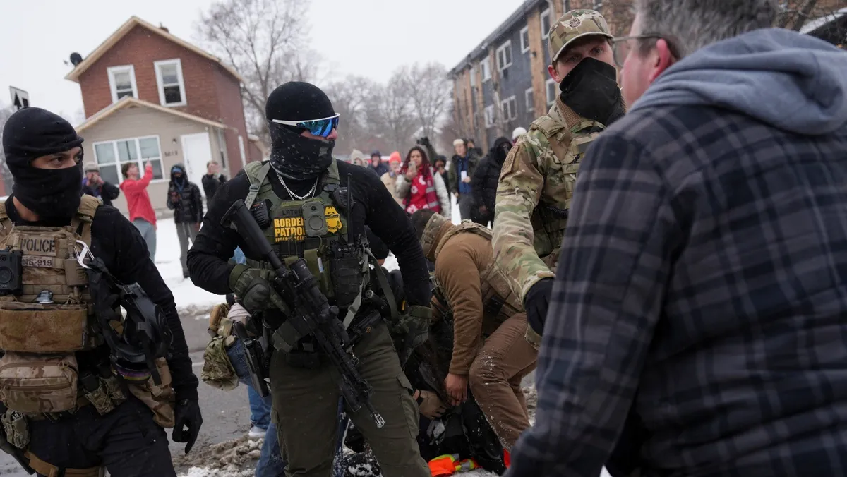 عملاء فيدراليون يعتقلون رجلاً أثناء قيامهم بإجراءات إنفاذ قوانين الهجرة في سانت بول بولاية مينيسوتا، الولايات المتحدة. 27 يناير 2026 - REUTERS