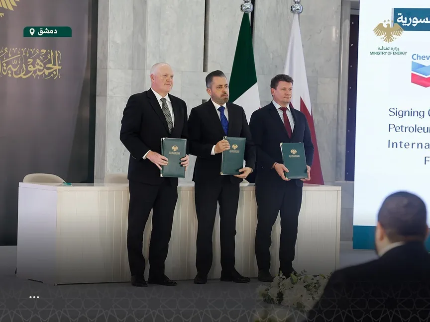 أعلنت وزارة الطاقة السورية توقيع مذكرة تفاهم تُعد الأولى من نوعها في مجال التنقيب والاستكشاف البحري، بين الشركة السورية للنفط وكلٍّ من شركة "شيفرون" الأميركية، إحدى كبرى شركات الطاقة عالمياً، وشركة "باور إنترناشونال القابضة" القطرية، في إطار استكشاف فرص الاستثمار في قطاعي النفط والغاز.