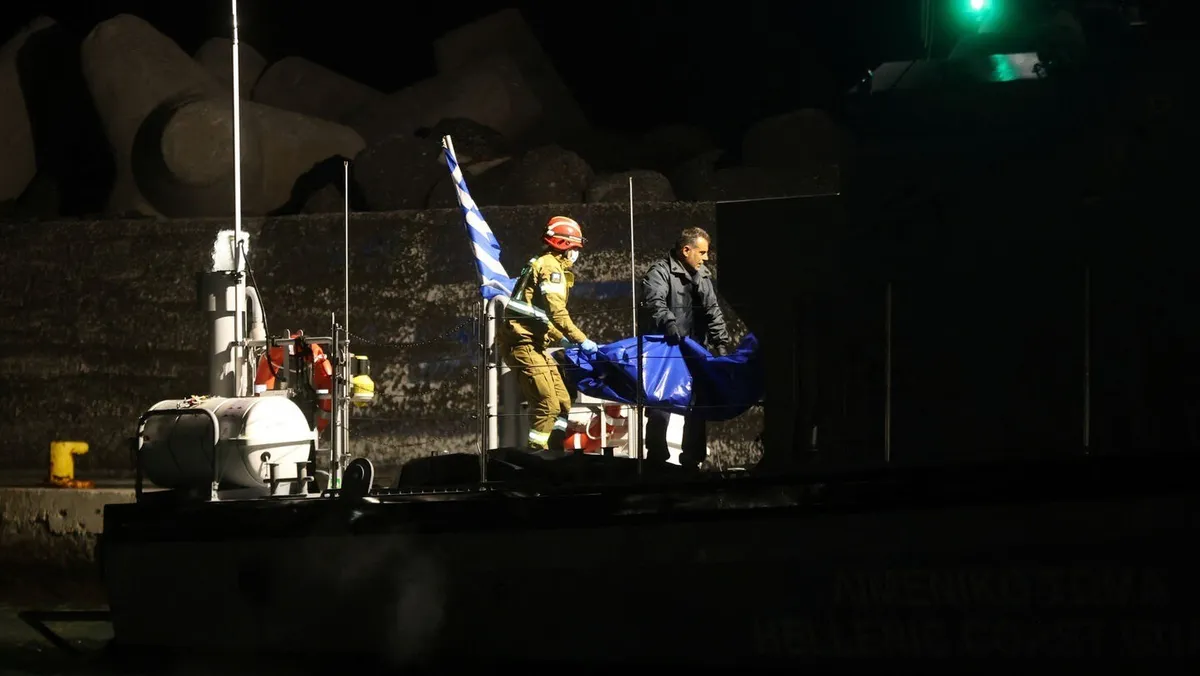 خفر السواحل يحملون جثامين مهاجرين بعد غرق سفينة قرب جزيرة كريسي الصغيرة، ميناء ييرابيترا، جزيرة كريت، اليونان. 6 ديسمبر 2025 - Reuters