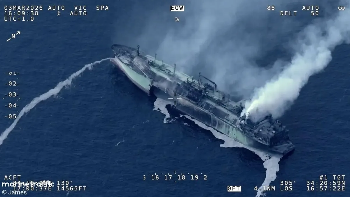 وقالت إن المعلومات تشير إلى أن الناقلة تعرضت لانفجارات مفاجئة؛ أعقبها حريق هائل أدى في النهاية إلى غرقها بالكامل.