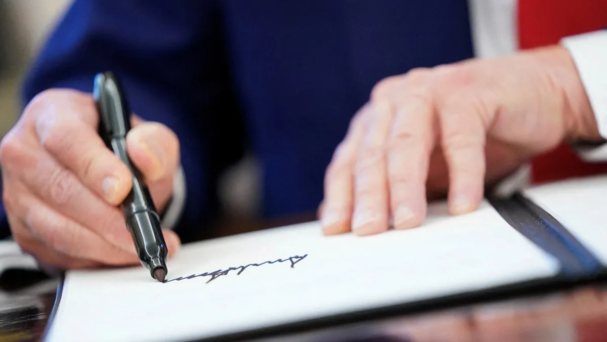 ويُعدّ هذا التغيير في التوقيع أحدث مساعي إدارة ترمب وحلفائها لوضع اسم الرئيس على المباني والمؤسسات والبرامج الحكومية والسفن الحربية والعملات المعدنية. وحظي تصميم عملة ذهبية تذكارية تحمل صورة ترمب بموافقة لجنة فنية اتحادية عيّن أعضاءها بنفسه.