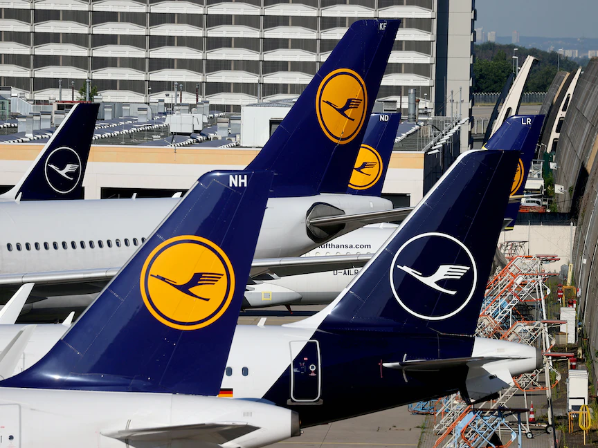 شعار شركة  لوفتهانزا على طائرات في مطار فرانكفورت الدولي - REUTERS