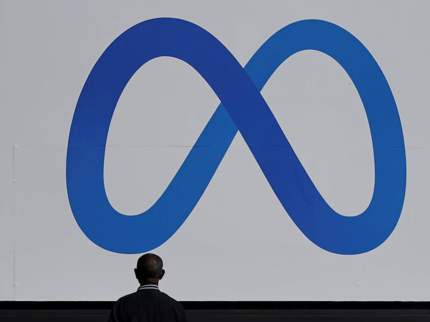رجل يقف أمام الشعار الجديد لشركة "فيسبوك" بعد تغيير اسمها إلى "ميتا" بمقرها في كاليفورنيا - 28 أكتوبر 2021 - REUTERS