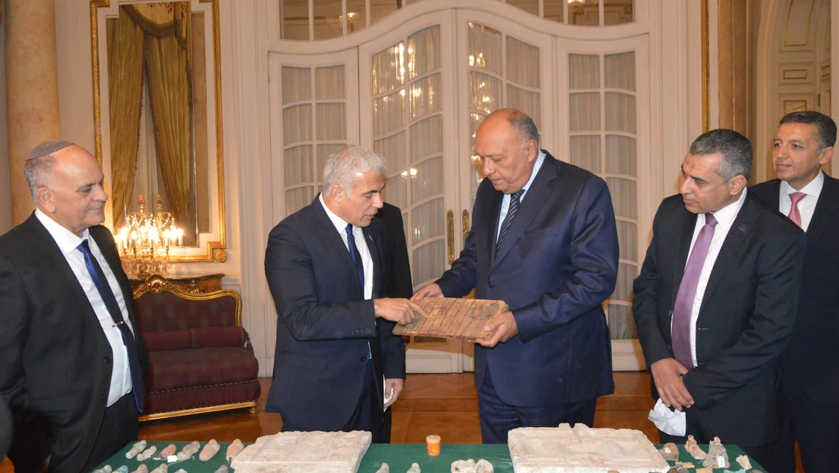 قدم وزير الخارجية الإسرائيلي يائير لبيد لمصر، الخميس، مجموعة من القطع الأثرية التي هُربت من القاهرة بشكل غير قانوني، وذلك بحضور نظيره المصري سامح شكري.