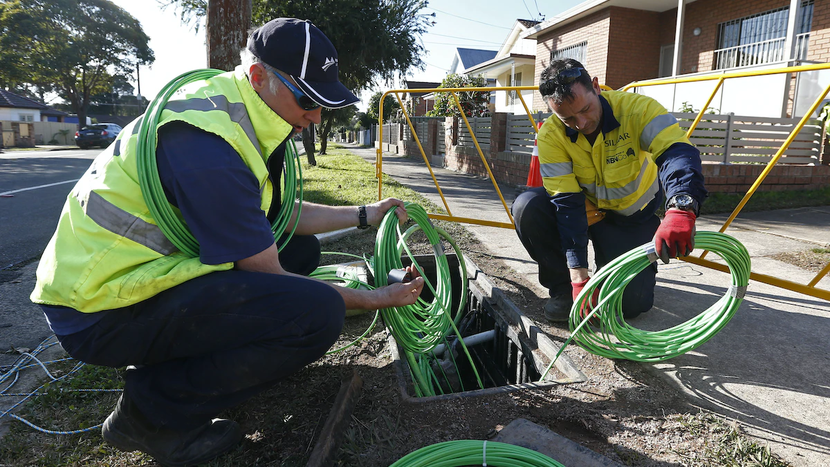 عمال أثناء تركيب كابلات الألياف الضوئية المستخدمة في شبكة الإنترنت ذات النطاق العريض الوطنية، سيدني، أستراليا. - REUTERS