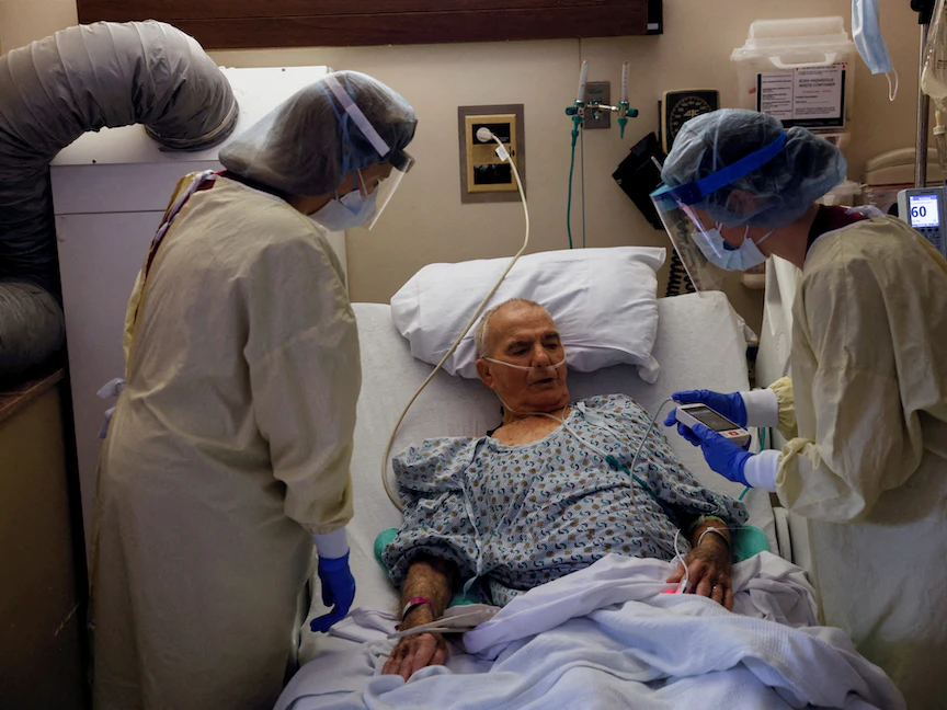 طاقم طبي يعالج مريض مصاب بفيروس كورونا في غرفته في طابق الوحدة الطبية المعزولة في مستشفى ويسترن ريزيرف في كوياهوجا فولز، أوهايو، الولايات المتحدة. 5 يناير 2022. - REUTERS