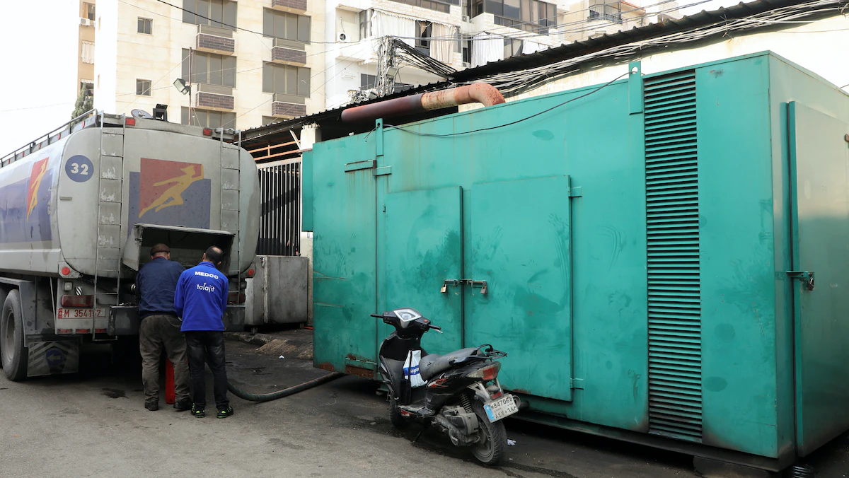 رجال يقومون بتعبئة مولداً خاصاً يوفر الكهرباء بزيت الديزل في بيروت، لبنان في 21 يناير 2022. - REUTERS