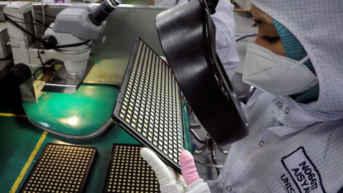 عامل يتفقد الرقائق في مصنع تعبئة أشباه الموصلات في إيبوه، ماليزيا. 15 أكتوبر 2021 - REUTERS