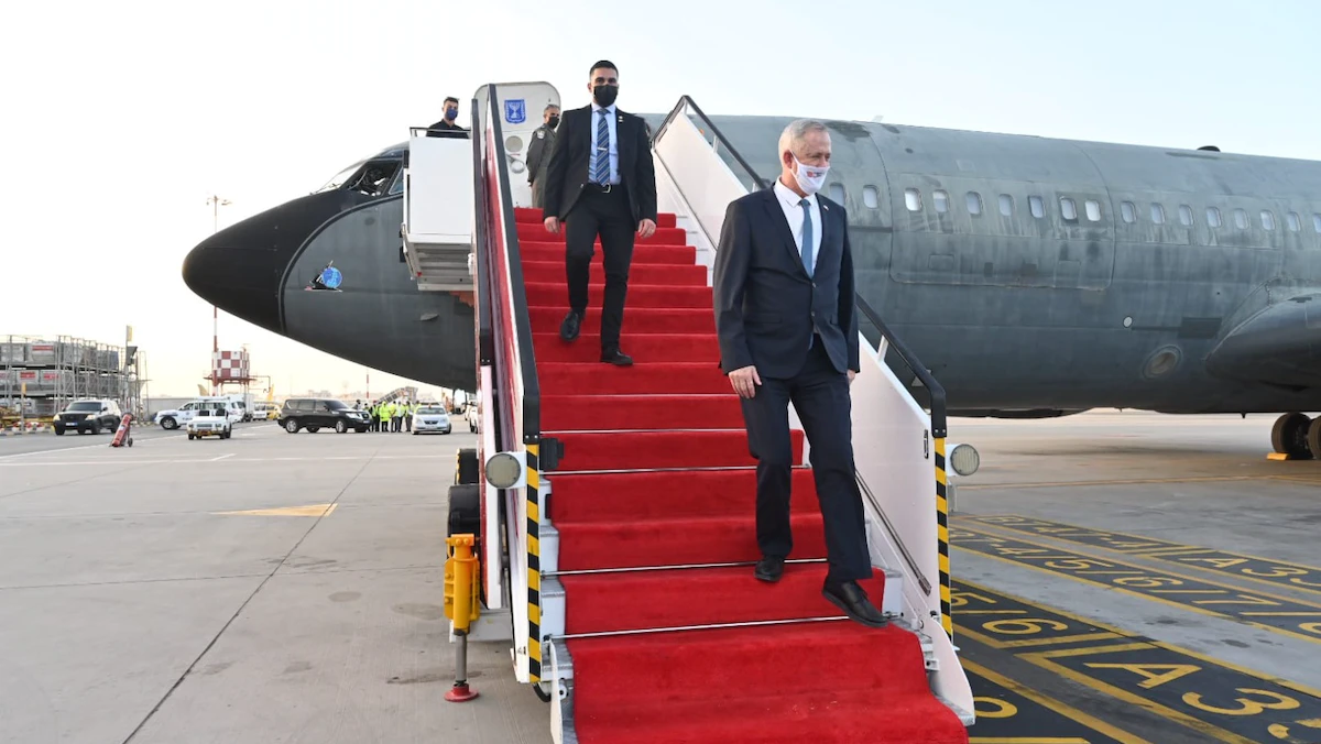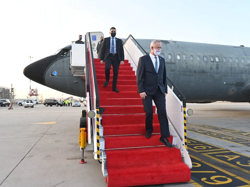 وزير الدفاع الإسرائيلي بيني جانتس لحظة نزوله من الطائرة "التاريخية" في مطار المنامة بالبحرين. 2 فبراير 2022 - twitter/gantzbe
