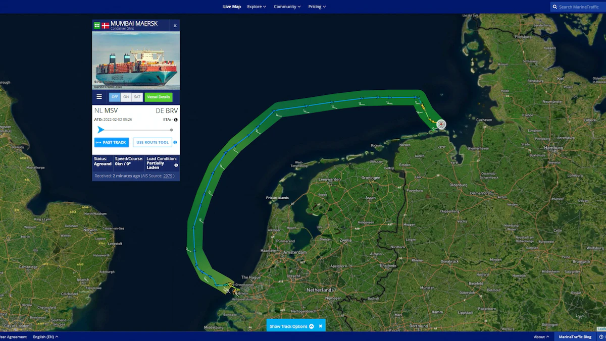 موقع سفينة الحاويات مومباي ميرسك التي ترفع علم الدنمارك في طريقها من روتردام في هولندا إلى مدينة بريمرهافن الألمانية - 3 فبراير 2022 - REUTERS