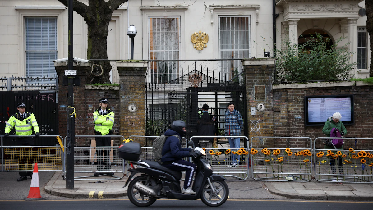 الشرطة البريطانية تحرس السفارة الروسية في أعقاب الغزو الروسي لأوكرانيا في لندن - 4 مارس 2022 - REUTERS
