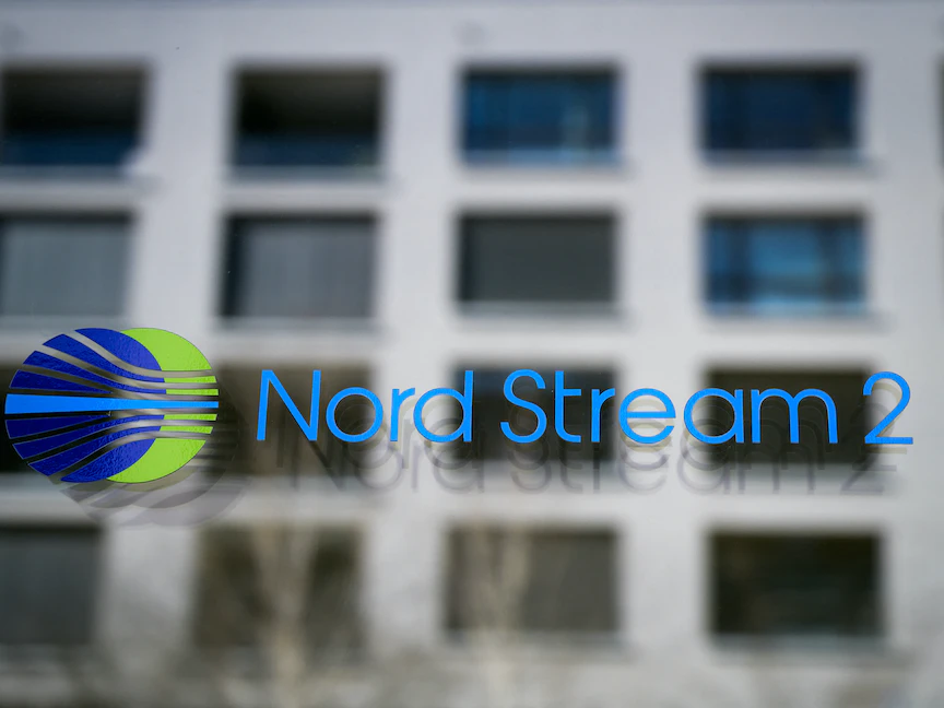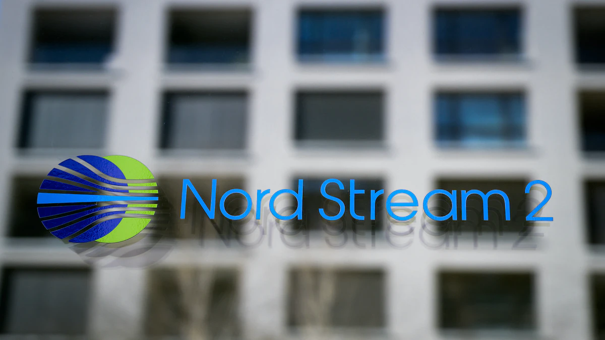 صورة التقطت في 4 مارس 2022 تظهر شعار شركة مشروع خط الأنابيب التي تتخذ من سويسرا مقراً لها، "نورد ستريم2"، والتي رفعت دعوى إفلاس، وسرحت كامل قوتها العاملة بعد الغزو الروسي لأوكرانيا - AFP