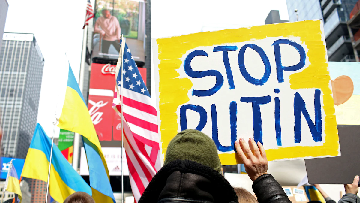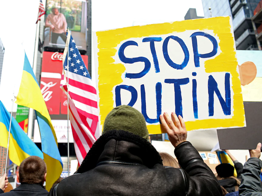 أميركي يرفع لافتة "أوقفوا بوتين" خلال مسيرة في نيويورك ضد الغزو الروسي لأوكرانيا. 5 مارس 2022 - REUTERS