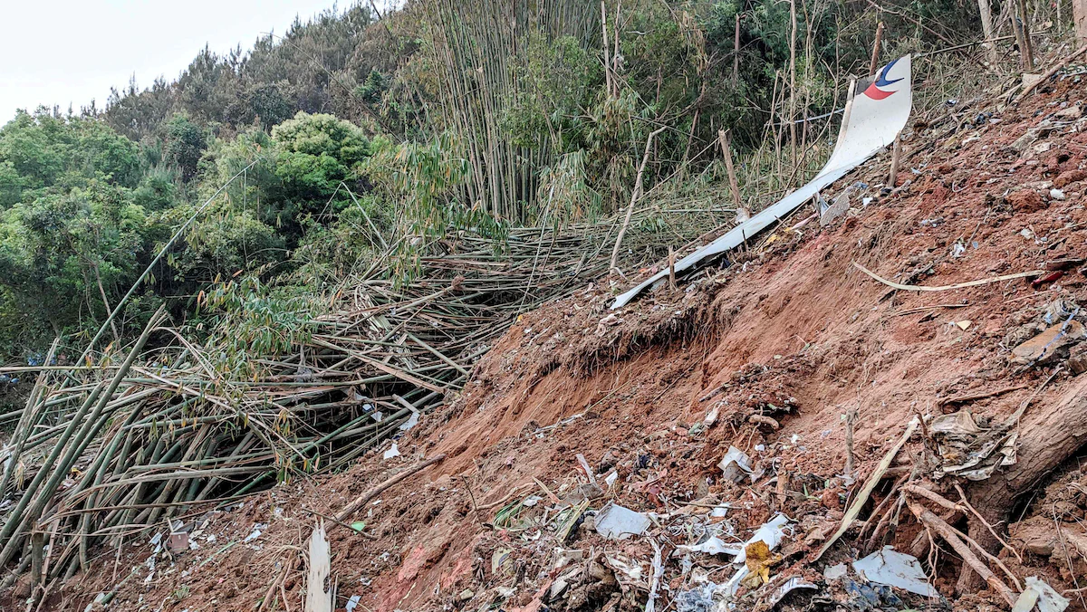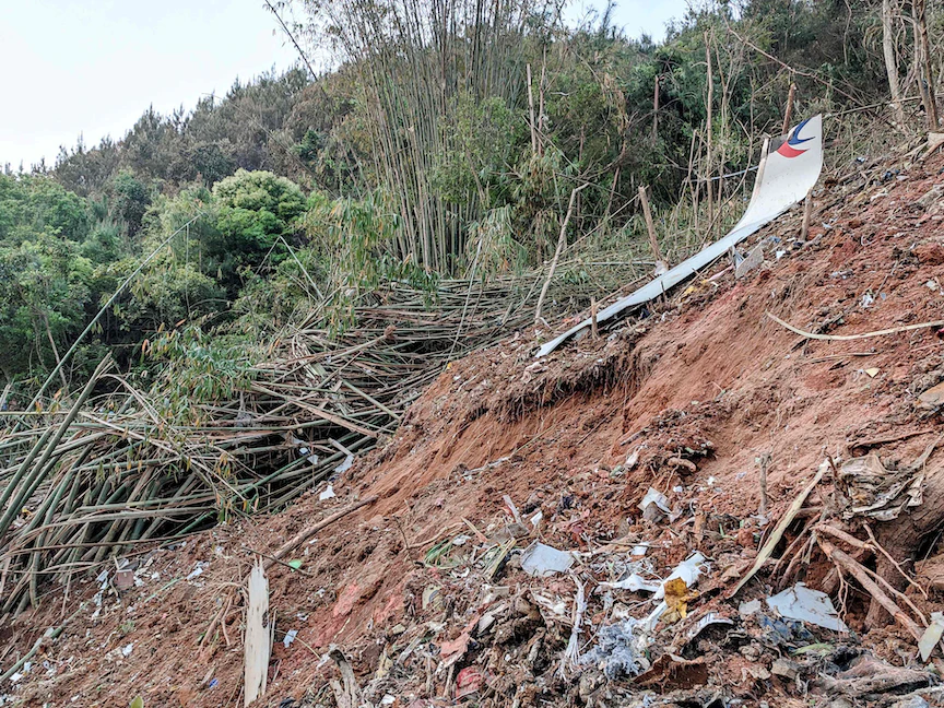 جزء من حطام طائرة شرق الصين التي تحطمت فوق منطقة جبلية بمدينة ووتشو وكانت تحمل على متنها 132 شخصاً – 12 مارس 2022 - AFP