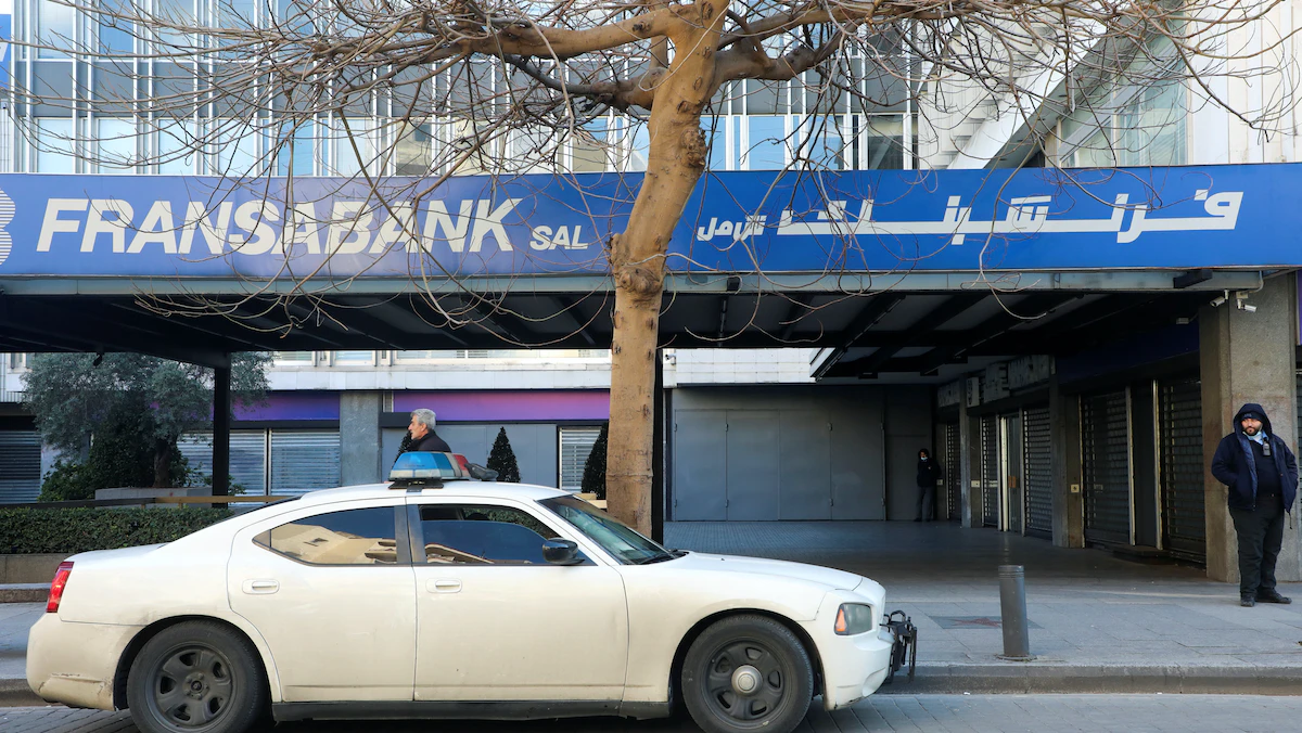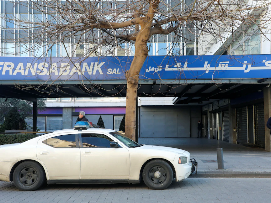 سيارة شرطة تقف أمام فرع فرانس بنك في بيروت، لبنان، 16 مارس 2022. - REUTERS