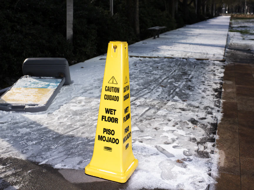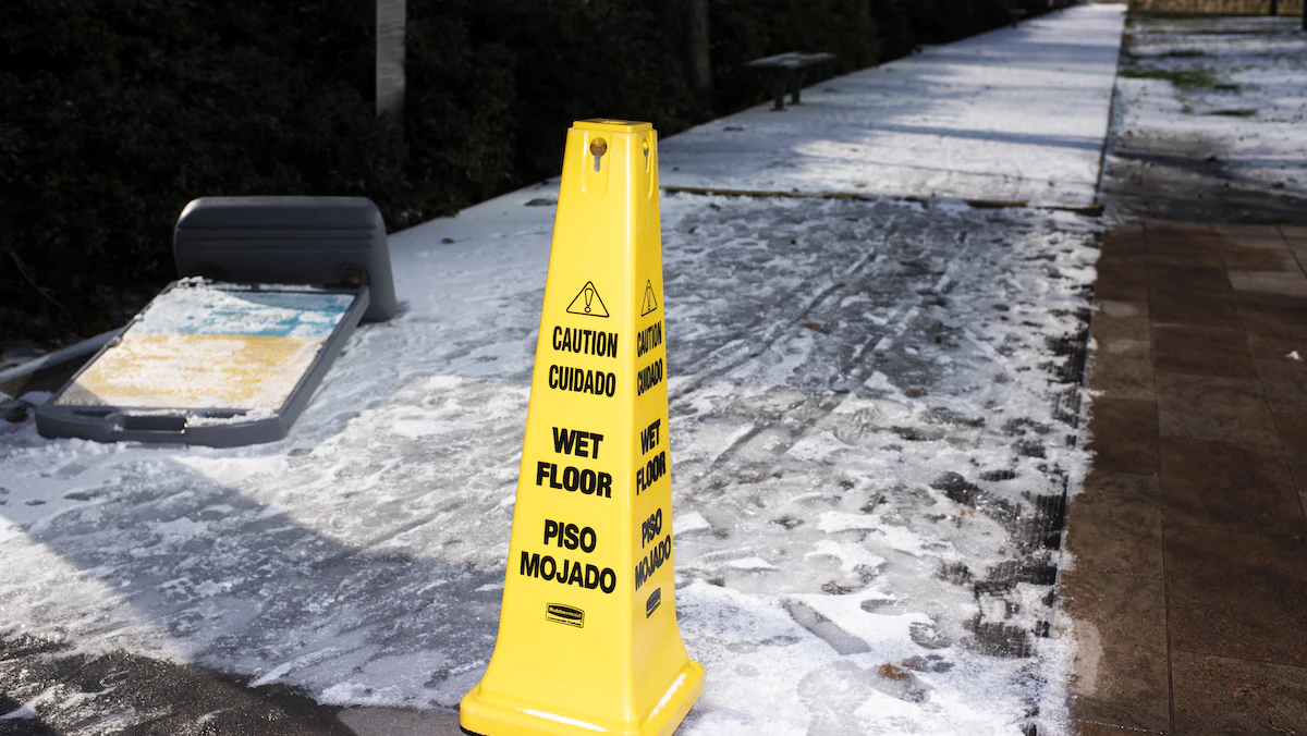 علامة تحذير على رصيف مكسو بالثلوج في هيوستن، تكساس، 15 فبراير 2021 - AFP