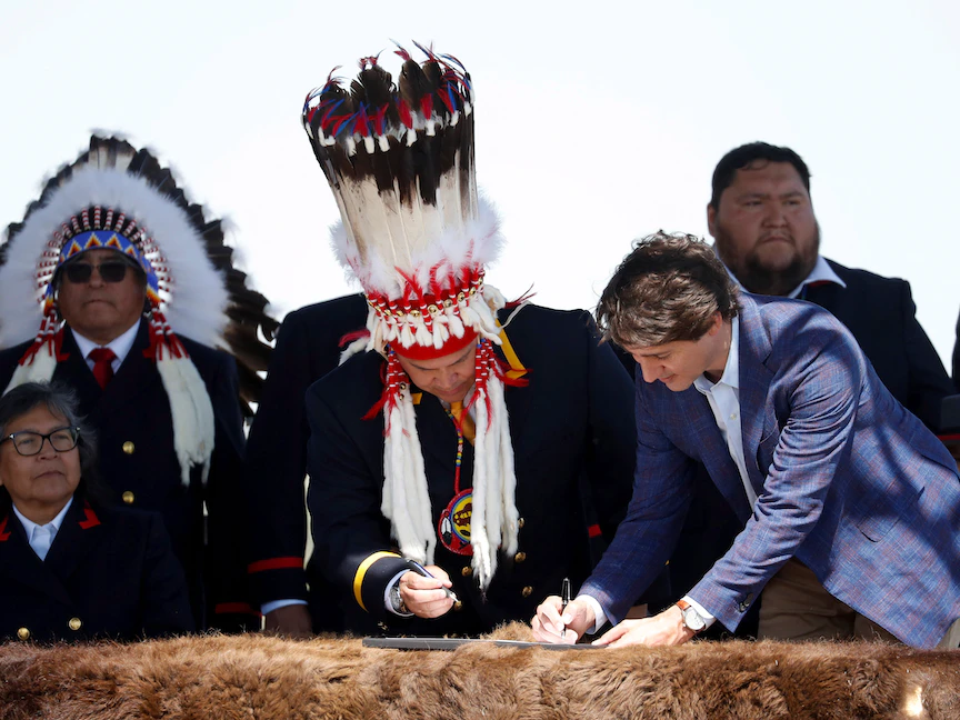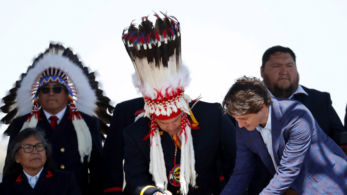 رئيس الوزراء الكندي جاستن ترودو خلال توقيع اتفاق مع "شعب سيكسيكا" بشأن التعويض المالي - ألبرتا - كندا - 2 يونيو 2022 - REUTERS