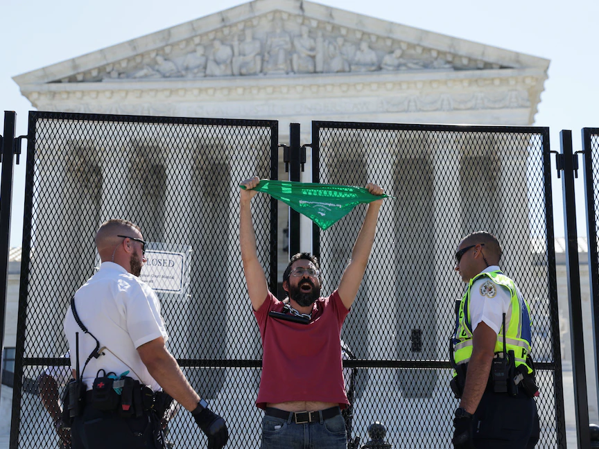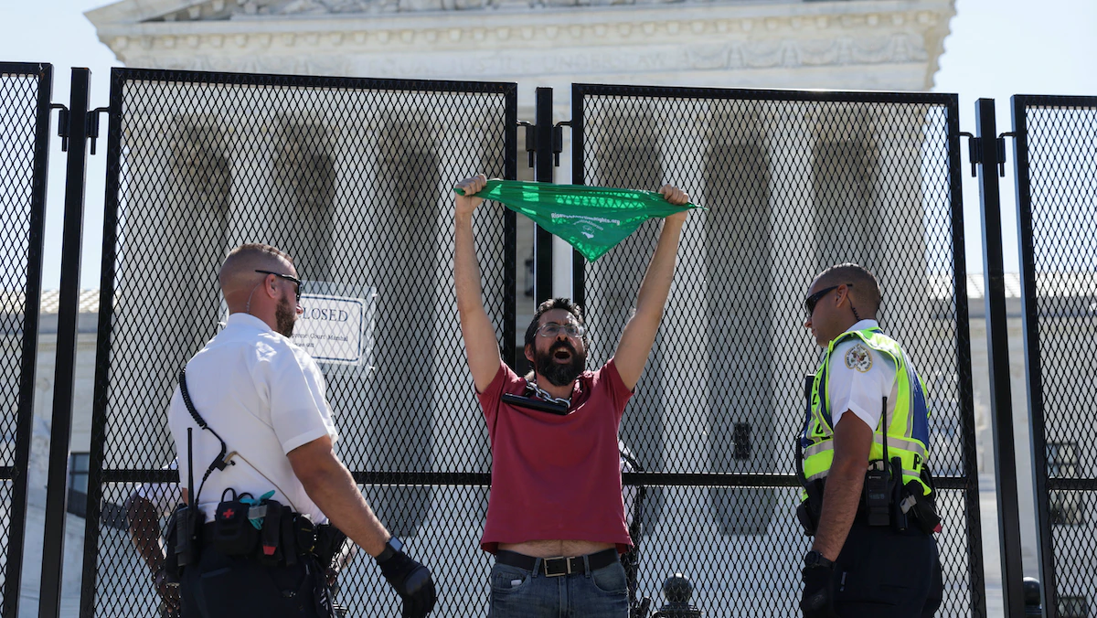 ومن أمام المحكمة العليا الأميركية، هتف رجل وهو يربط عنقه بقفل دراجة قوي، قائلاً: "هل ستلغون الحكم في قضية رو؟ لا لهذا الجحيم!"، بينما وقفت على مقربة منه مجموعة من المحتجين المناهضين للإجهاض وهم يرفعون لافتات ويرددون هتافات مضادة.