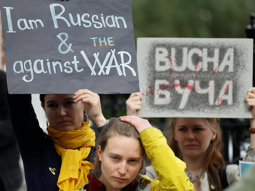 مظاهرة بعنوان "الروس ضد الحرب" أمام سفارة روسيا في لندن، بريطانيا. 24 أبريل 2022 - REUTERS