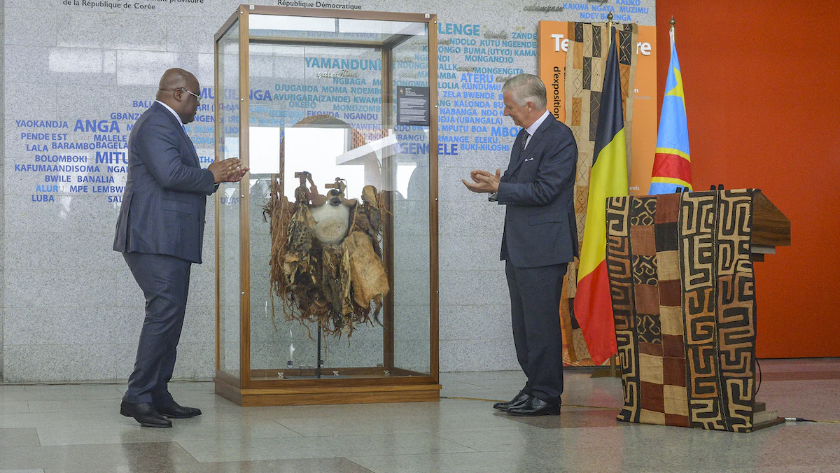 رئيس جمهورية الكونجو الديمقراطية فيليكس تشيسكيدي (يسار) يلقي نظرة على قناع سلمه الملك فيليب ملك بلجيكا (يمين) في المتحف الوطني لجمهورية الكونجو الديمقراطية، كينشاسا - 8 يونيو 2022. - AFP