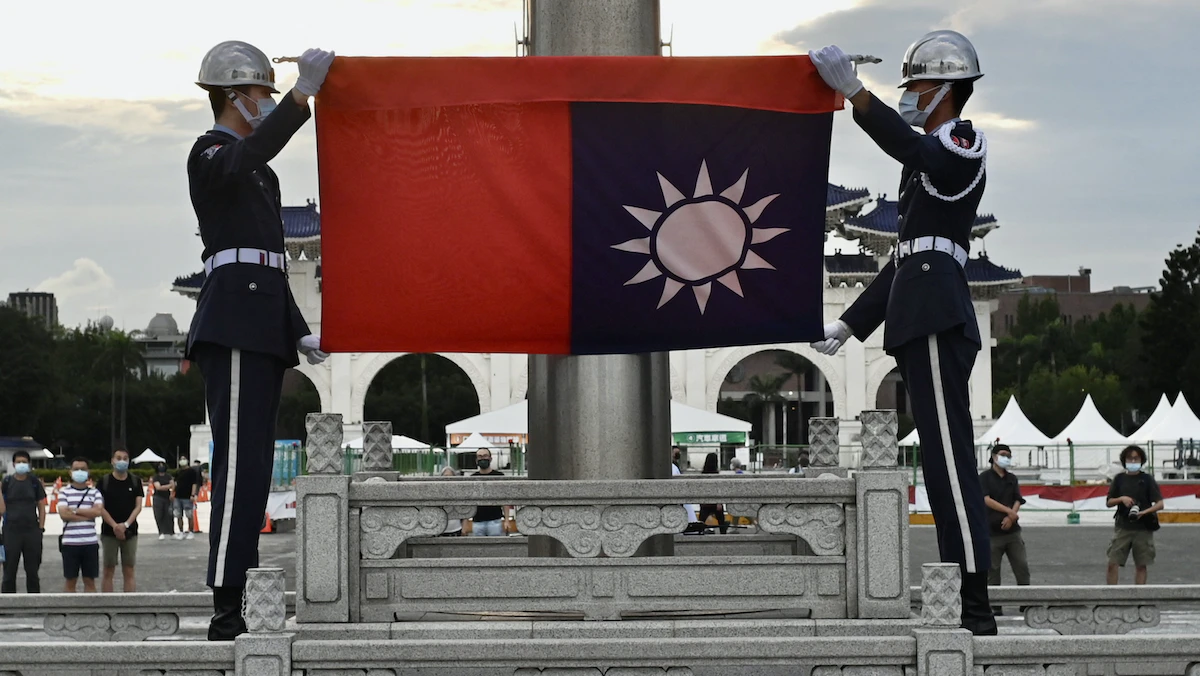 حراس الشرف يلفون علم تايوان خلال حفل إنزال العلم في قاعة شيانج كاي شيك التذكارية في تايبيه، تايوان في 4 يونيو 2022 - AFP