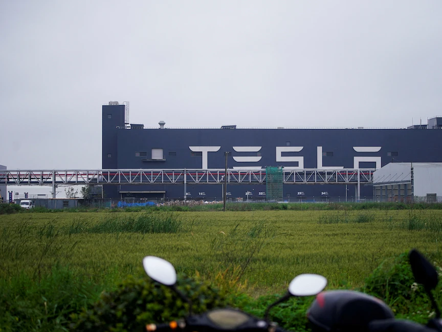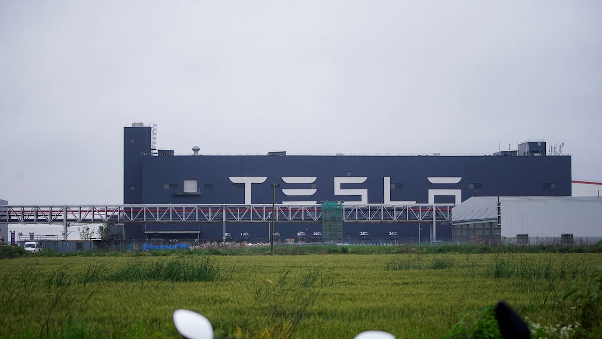 لافتة شركة "تيسلا" الأميركية لإنتاج السيارات الكهربائية على أحد مصانعها في شنغهاي بالصين - 13 مايو 2021 - REUTERS