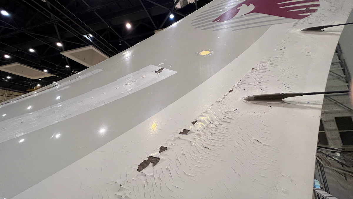 وشاهدت "رويترز" أجزاء صغيرة لما بدا أنه خيوط كربونية مهترئة أو مفككة على جسم الطائرة وكذلك تقشر الطلاء على أجزاء رئيسية من الجناحين.