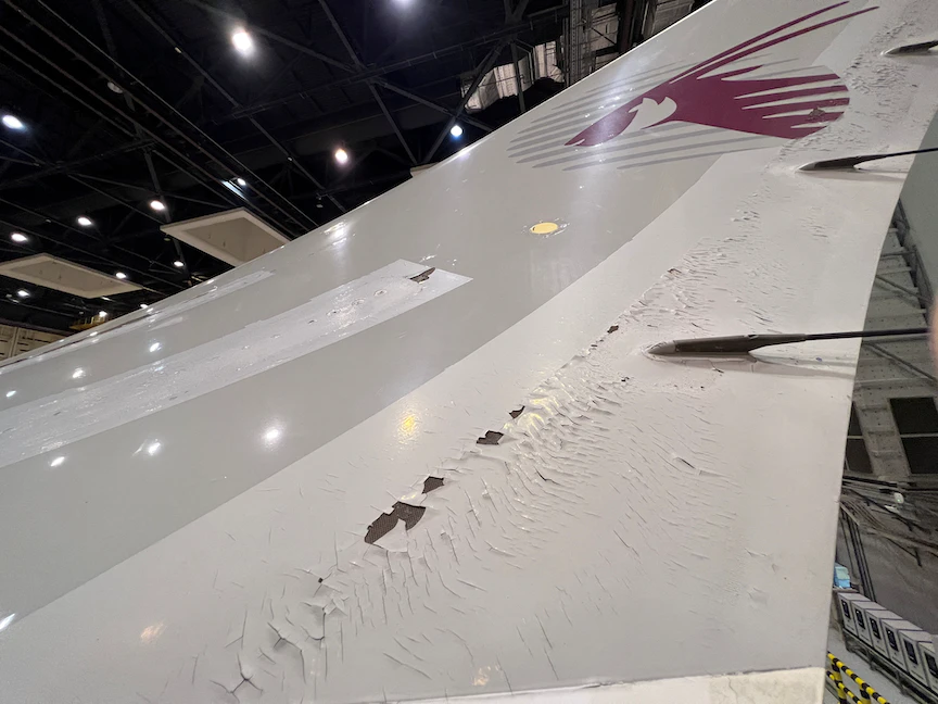 وفي أجزاء أخرى بدت الشبكة غير موجودة، كذلك تاركة أجزاء من الجسم مكشوفة لعوامل البيئة، كما كان الطلاء الموجود على ذيل إحدى الطائرتين والمزين بالشعار العنابي اللون لحيوان المها العربي الخاص بالخطوط الجوية القطرية، مشققاً ومقشراً ما تسبب في انكشاف الطبقة الموجودة بالأسفل.