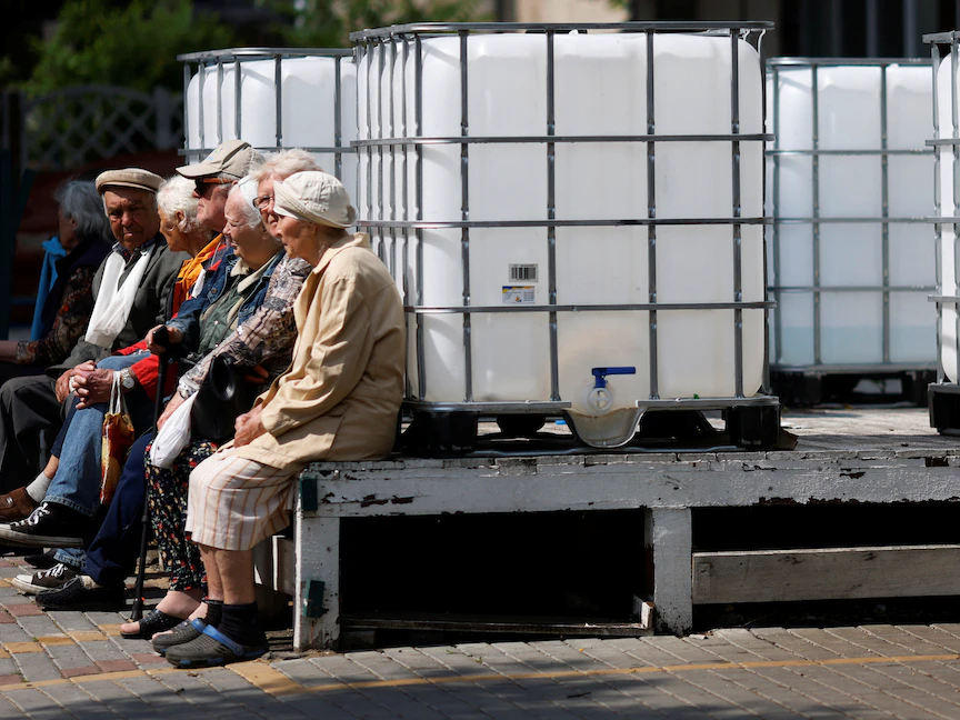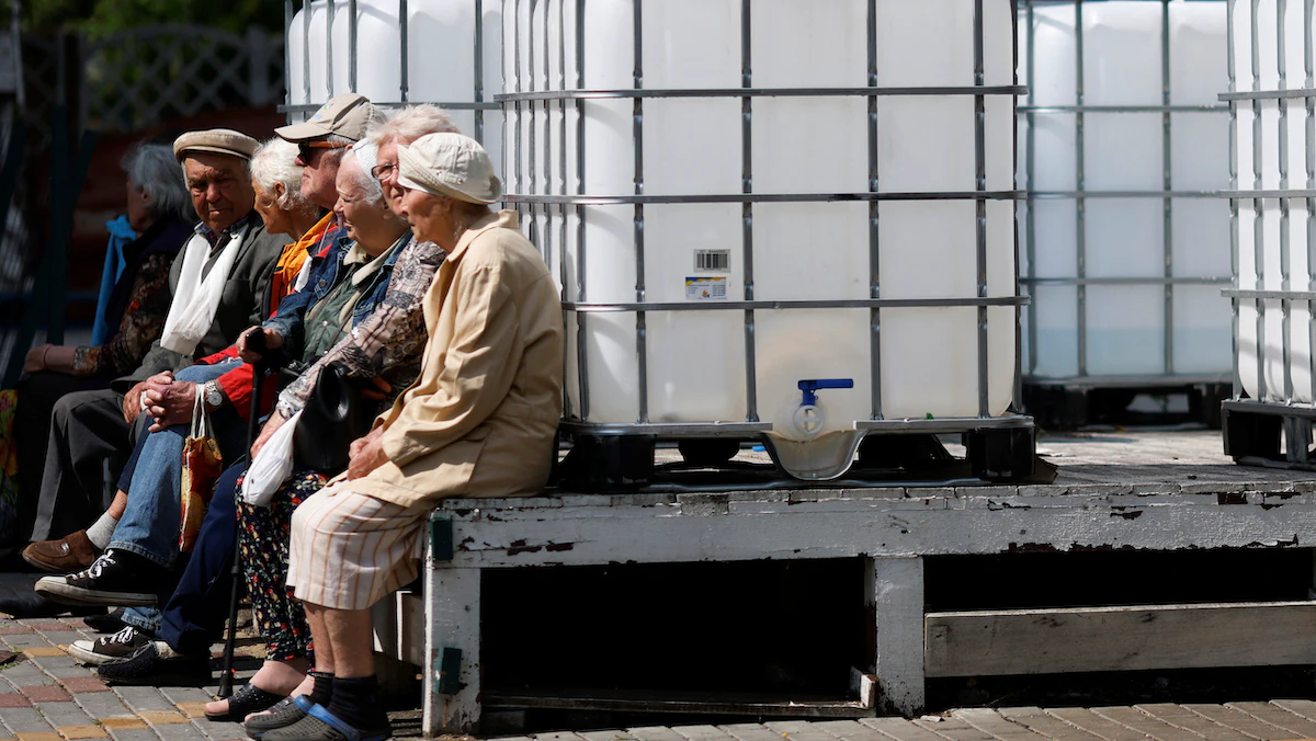 مسنون ينتظرون بجانب حاويات المياه الفارغة لجمع المساعدات الإنسانية عند نقطة توزيع تابعة للصليب الأحمر في ميكولايف، أوكرانيا- 10 يونيو 2022. - REUTERS
