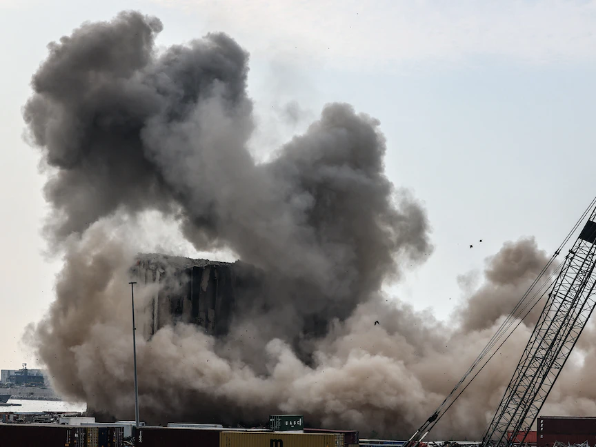 وعند انهيار جزء من الصوامع الشمالية الأكثر تضرراً من الكارثة، الأحد، انبعث دخان وغبار أعاد إلى الأذهان سحابة ضخمة خلّفها الانفجار قبل عامين وأمكن رؤيتها من مناطق عدة.