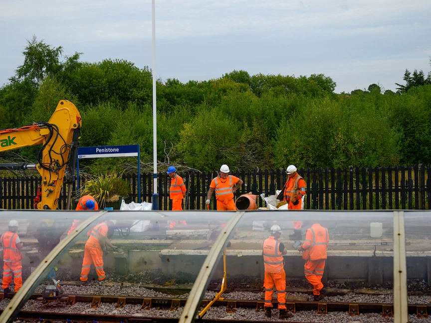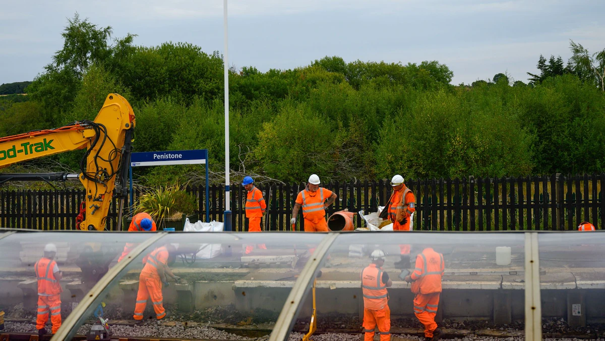 عمال يصلحون رصيف محطة قطارات في مدينة بينيستون الصناعية والتي صوتت لصالح بريكست رغم تأييدها حزب العمال تاريخياً – بريطانيا – 28 يوليو 2022 - Bloomberg