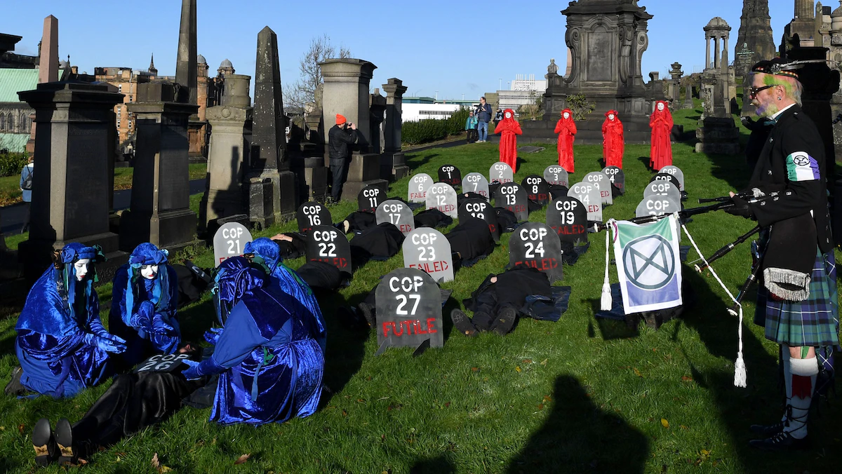 نشطاء ينصبون شواهد قبور مزيفة بأسماء مؤتمرات المناخ السابقة في مدينة جلاسكو الاسكتلندية. 13 نوفمبر 2021. - AFP