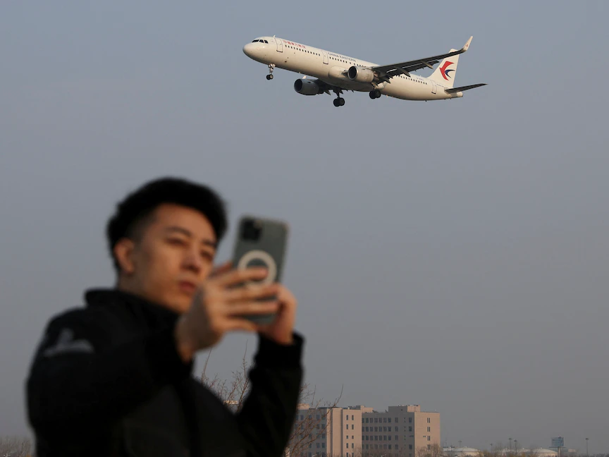 رجل يلتقط صورة سيلفي أثناء هبوط طائرة تابعة لشركة طيران شرق الصين في مطار العاصمة بكين الدولي في بكين ، الصين- 23 مارس 2022 - REUTERS