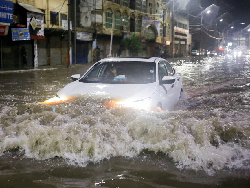 سيارة تسير على طول شارع غمرته المياه بعد هطول أمطار غزيرة في كراتشي ، باكستان- 24 يوليو 2022 - REUTERS