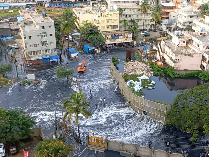 وقال دعاة حماية البيئة إن السبب في حدوث الفيضانات هو التخطيط الحضري السيئ، إذ توسعت المدينة سريعة النمو على مر السنين، بالإضافة إلى تغير المناخ الذي قيل أيضاً إنه السبب في الفيضانات الكارثية في باكستان المجاورة.