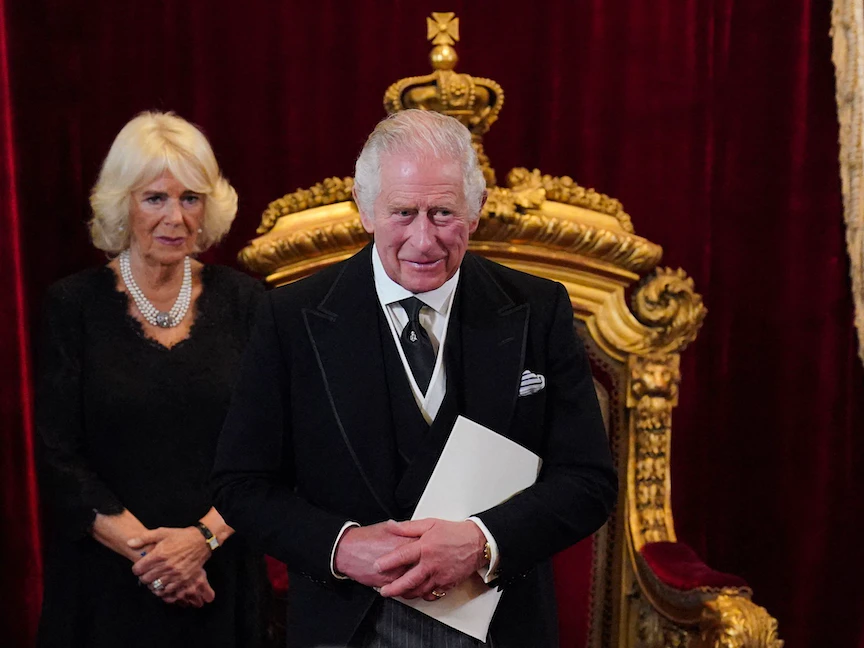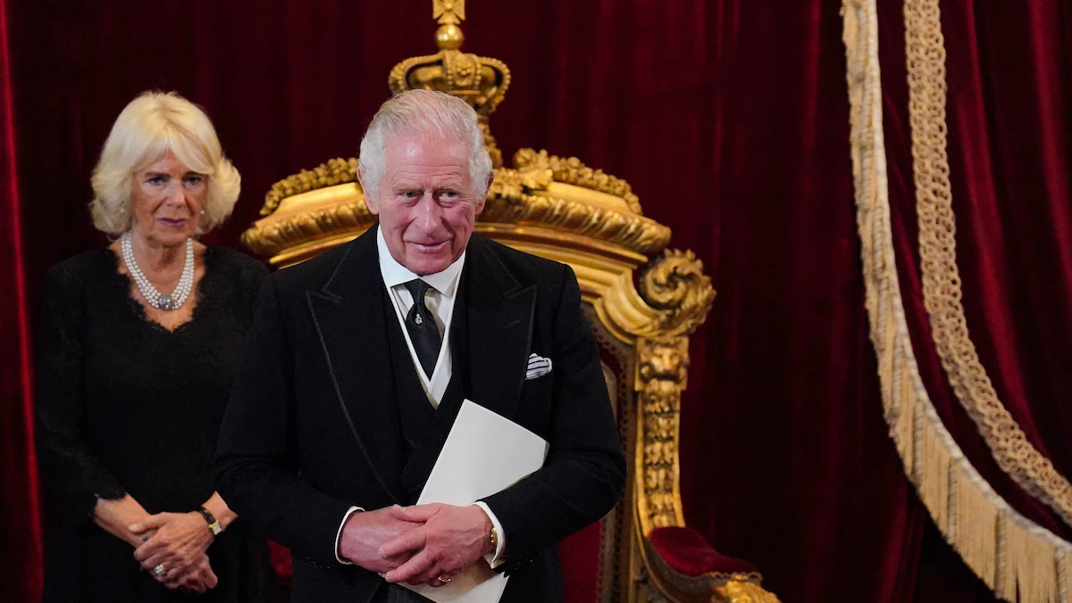 ملك بريطانيا الجديد تشارلز الثالث وزوجته كاميلا خلال إعلان تنصيبه رسمياً داخل قصر سانت جيمس في لندن. 10 سبتمبر 2022 - AFP