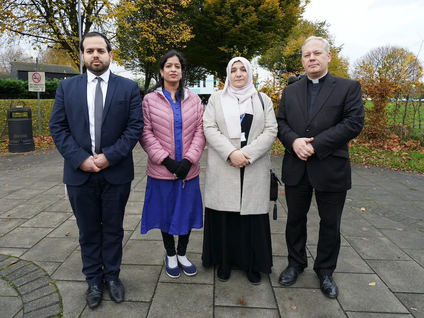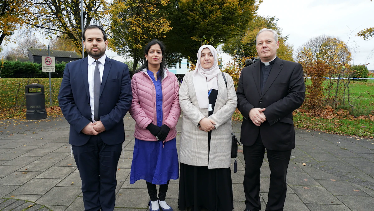 ممثلو الأديان في بريطانيا (من اليسار) الحاخام أفينوعام كسيترون ممثل الجالية اليهودية وبريانكا موهتا ممثلة الجالية الهندوسية وليلى مشجاري ممثلة المسلمين والدكتور كريسبين بايلنج ممثل المجتمع المسيحي يقفون خارج مستشفى ليفربول للنساء - 16 نوفمبر 2021 - REUTERS