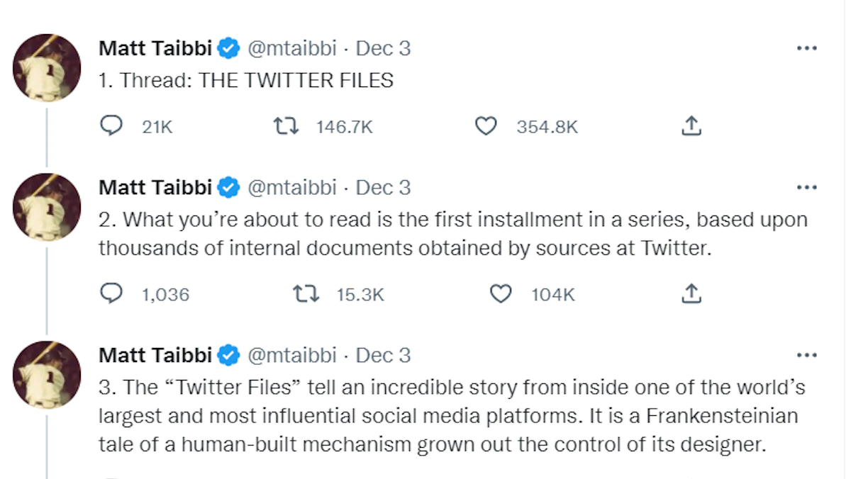 صورة لجزء من سلسلة تغريدات الصحافي مات تاييبي على تويتر - 3 ديسمبر 2022