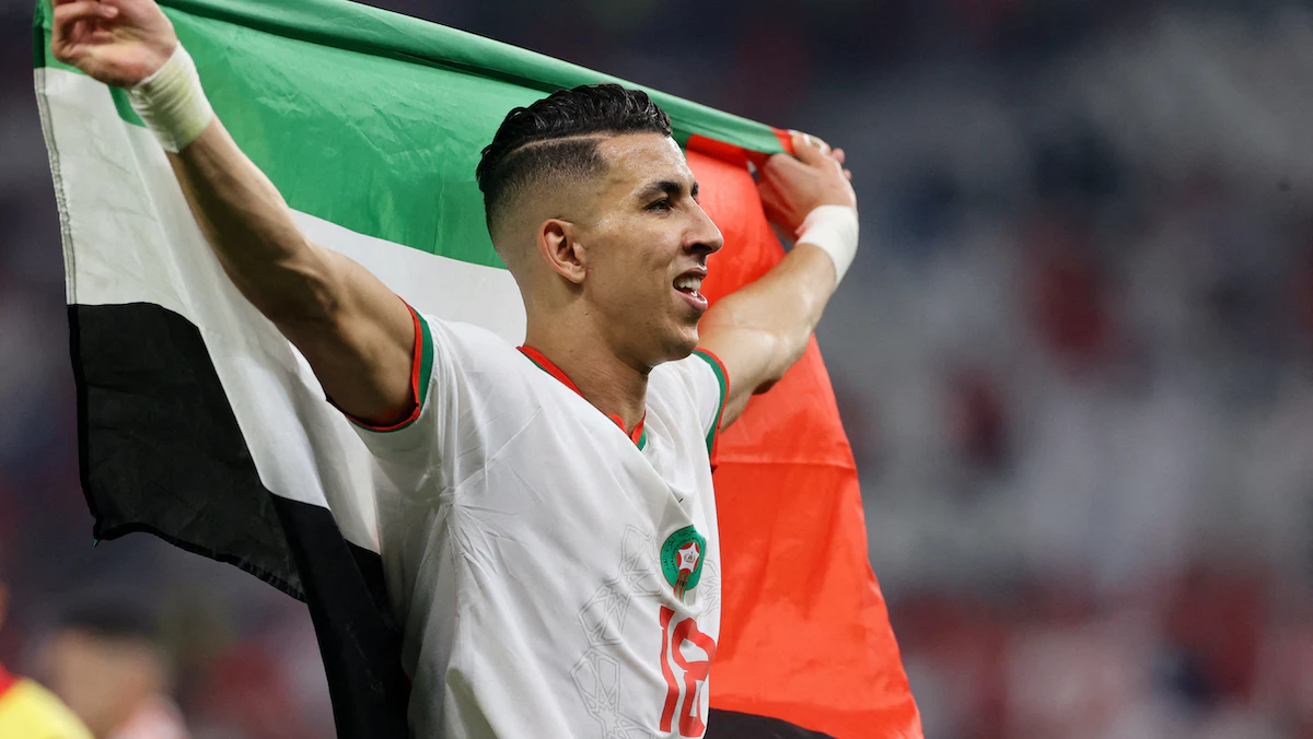 جواد الياميق لاعب المنتخب المغربي لكرة القدم يحمل علم فلسطين مع احتفاله بتأهل فريقه لربع نهائي كأس العالم قطر 2022 المقام في الدوحة. 1 ديسمبر 2022 - REUTERS