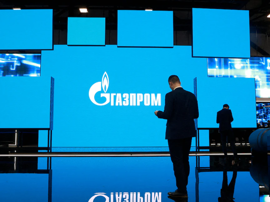 شعار شركة "غازبروم" الروسية على شاشة خلال منتدى سانت بطرسبرج الدولي للغاز في مدينة سانت بطرسبرج الروسية- 15 سبتمبر 2022 - REUTERS