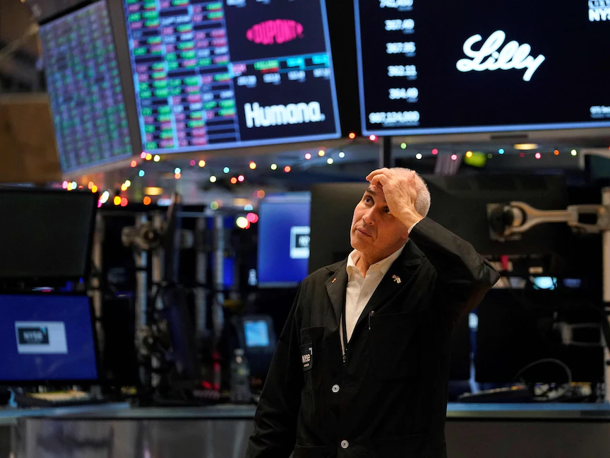 أحد المتداولين في بورصة نيويورك يتفاعل عند جرس الإغلاق الولايات المتحدة. 30 ديسمبر 2022 - AFP