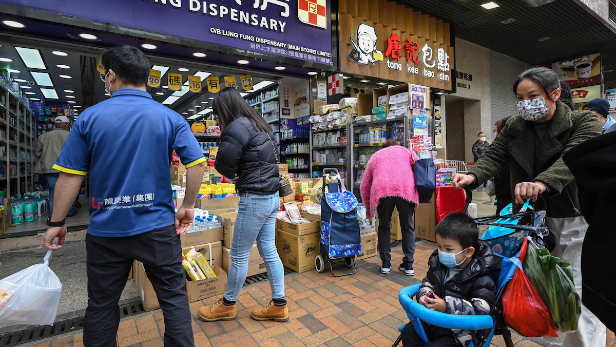 تسوق الناس في أحد شوارع بلدة "شيونج شوي" في هونج كونج بالقرب من حدود البر الرئيسي للصين. 4 يناير 2023 - AFP