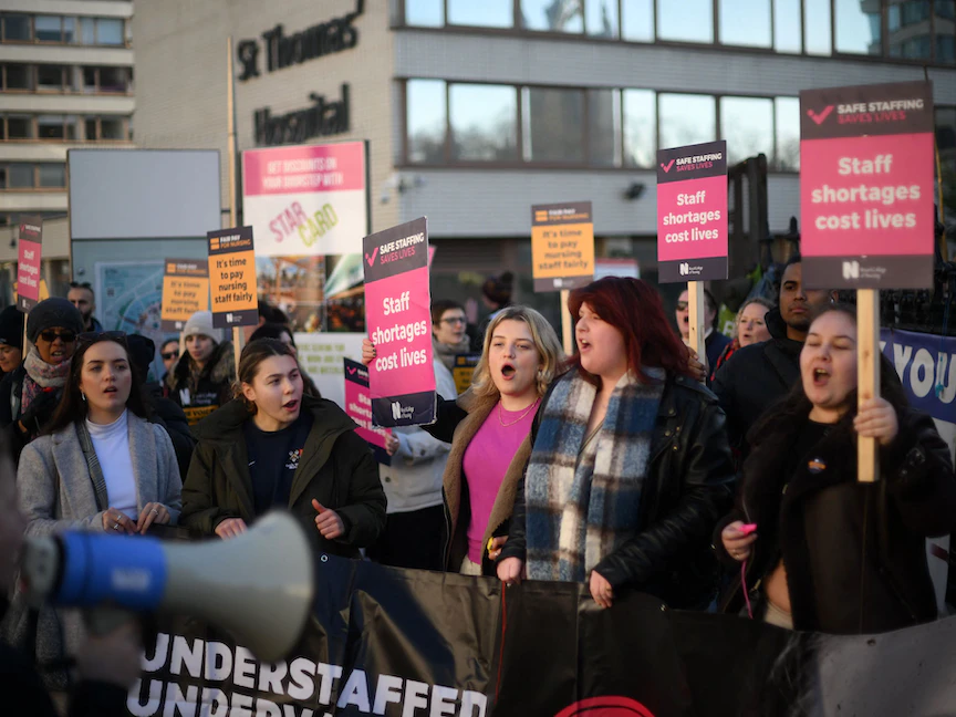 وشارك في إضراب مطلع الأسبوع في إنجلترا آلاف الممرضين والممرضات الذين يمثلون أكثر من 73 وحدة طبية تعمل تحت ظل هيئة الصحة الوطنية، بالإضافة إلى حوالي عشرة آلاف موظف في خدمة الإسعاف. فكان أضخم حراك يشهده القطاع الصحي في تاريخه، وأدى إلى تأجيل 80 ألف موعد طبي، وإلغاء 11 ألف عملية.