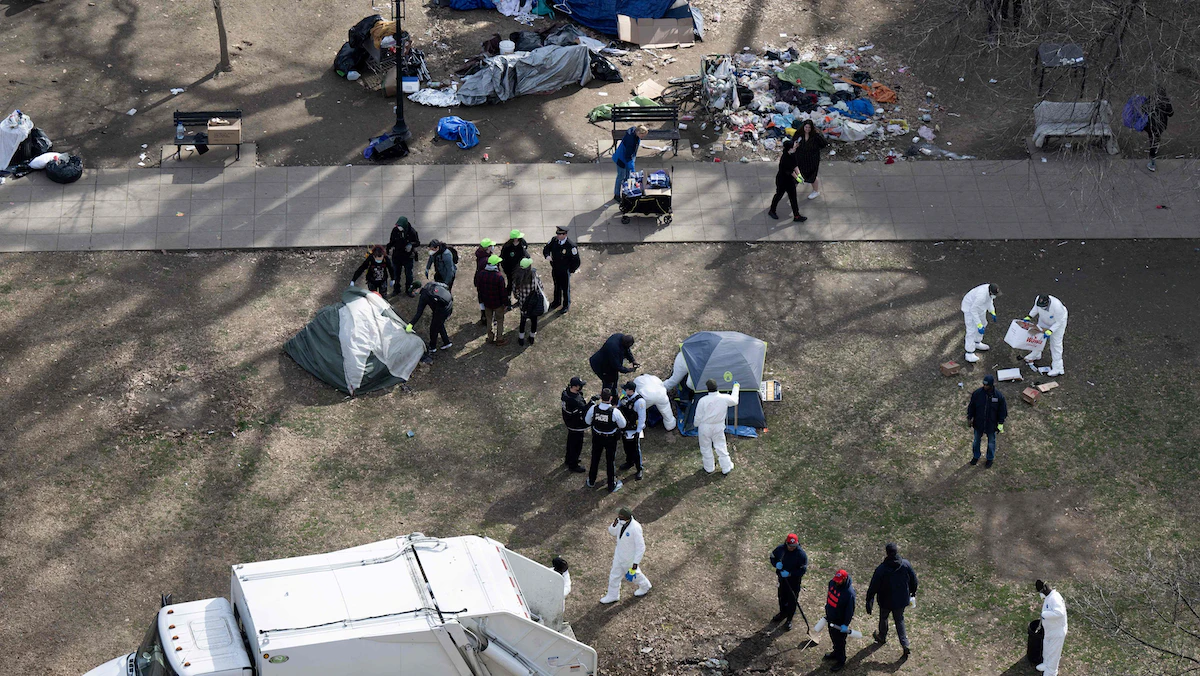 وكان موظفو المكاتب بوسط المدينة يراقبون أفراد الطواقم وهم يفككون الخيم العشوائية ويكدسون مقتنيات قاطنيها المشردين في شاحنات نفايات بساحة ماكفيرسون.