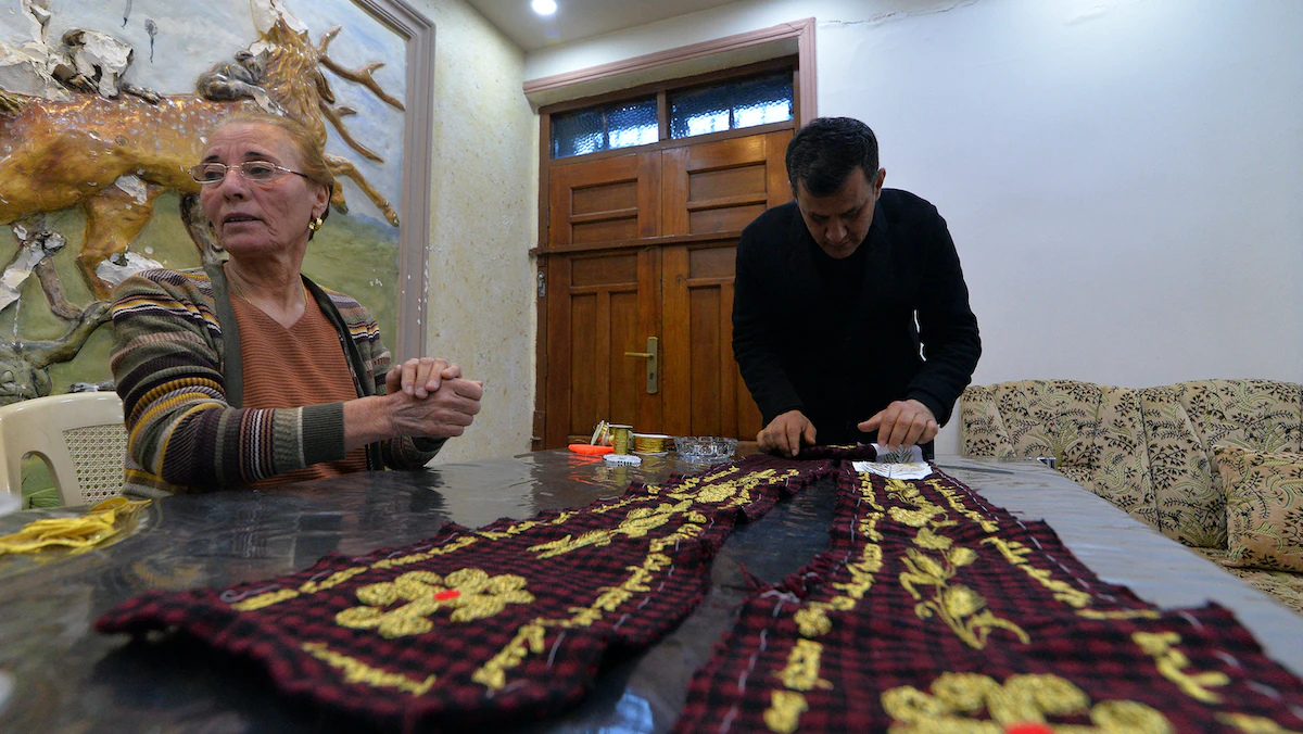 ينكب مجموعة من سكان بلدة قرقوش الواقعة في محافظة نينوى شمال العراق، على وضع اللمسات الأخيرة بخيوط ذهبية على وشاح اختار أهالي البلدة تقديمه للبابا فرنسيس خلال زيارته لها ضمن جولته التي بدأها الجمعة في العراق.