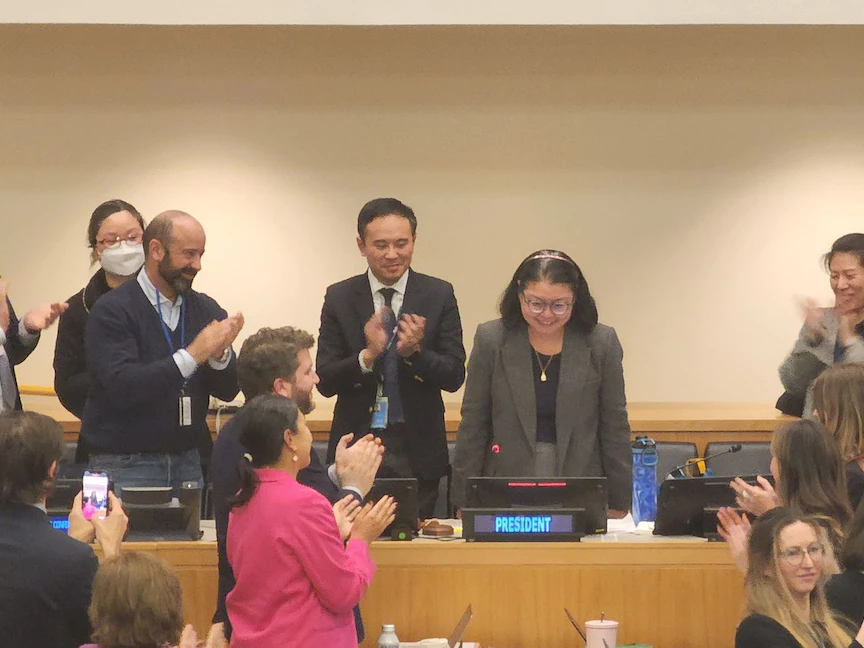 ووسط هتافات الوفود، أعلنت رئيسة المؤتمر الذي بحث الاتفاق، رينا لي، في مقر الأمم المتحدة في نيويورك (الساعة 02:30 بتوقيت جرينتش الأحد)، أن "السفينة وصلت إلى الشاطئ".