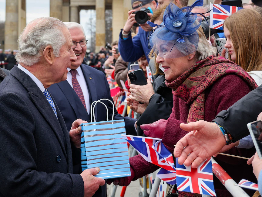 وتوجه الملك وزوجته، بعدما استقبلهما رئيس البروتوكول الألماني والسفير البريطاني في ألمانيا، إلى بوابة براندنبورج في وسط برلين حيث استقبلهما الرئيس الألماني فرانك-فالتر شتاينماير وزوجته.