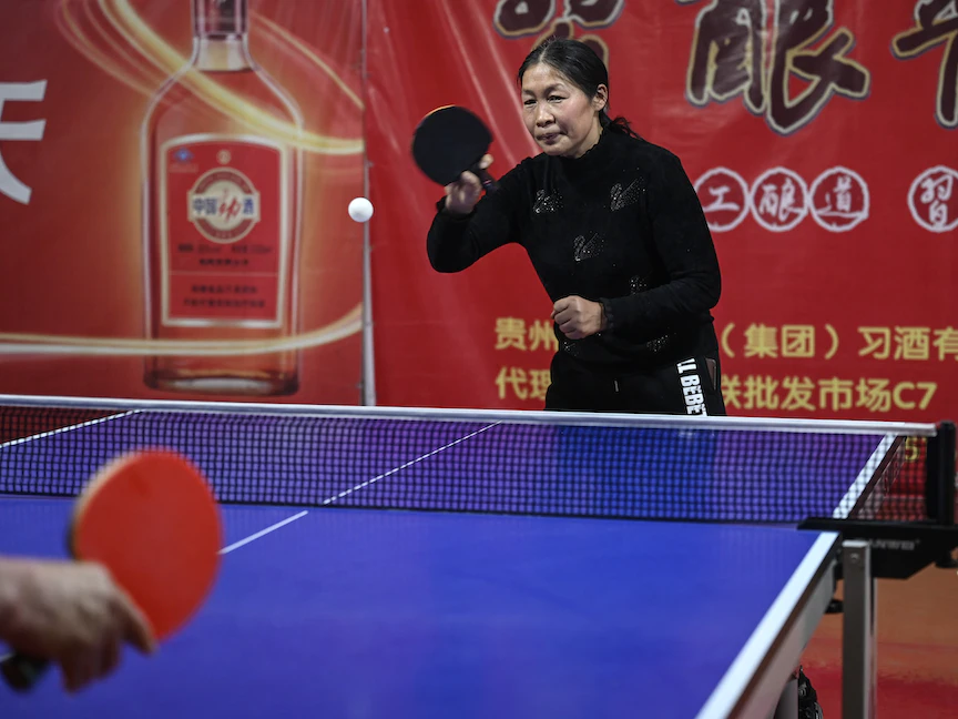 ويحافظ مسنّون داخل صالة رياضية في المدينة على لياقتهم البدنية من خلال ممارسة كرة الطاولة.